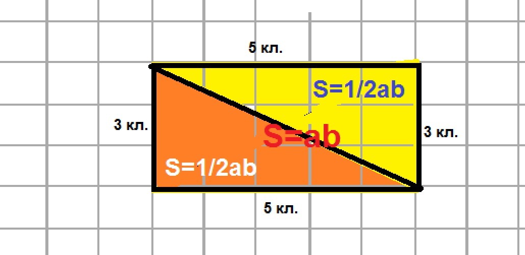 3) Диагональ делит прямоугольник на 2, равных друг другу, прямоугольных треугольника. Формула площади прямоугольного треугольника S=1/2ab