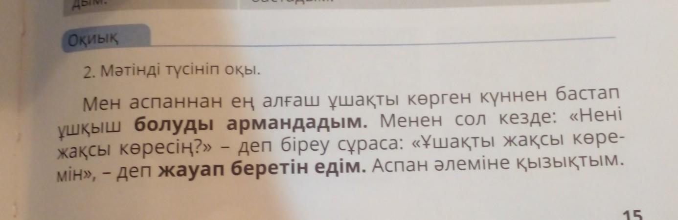Оқиық 2. Мәтінді түсініп оқы. Мен аспаннан ең алғаш ұшақты көрген күннен бастап ұшқыш болуды армандадым. Менен сол кезде: «Нені жақсы көресің?» - деп біреу сұраса: «Ұшақты жақсы көре- мін», - деп жауап беретін едім. Аспан әлеміне қызықтым.