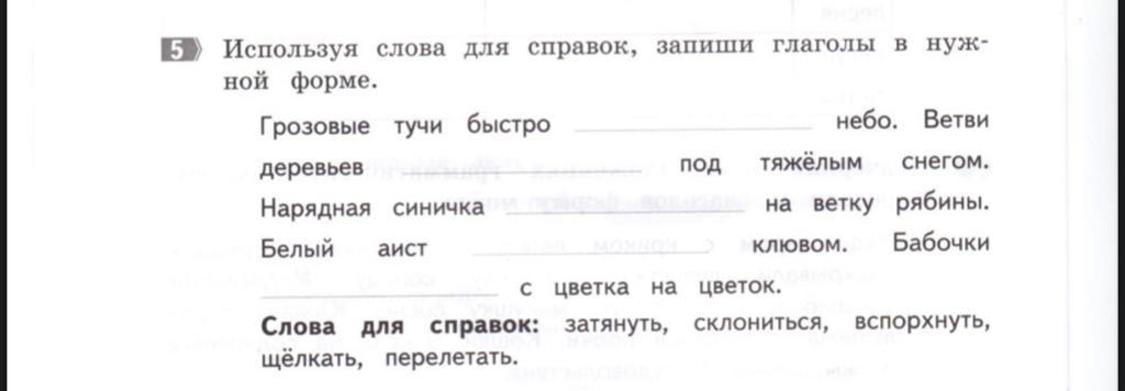Грозные тучи быстро затянули небо. Ветви деревьев склонились под тяжёлым снегом. Нарядная синичка вспорхнула на ветку рябины. Белый аист щёлкал клювом. Бабочки перелетели с цветка на цветок.