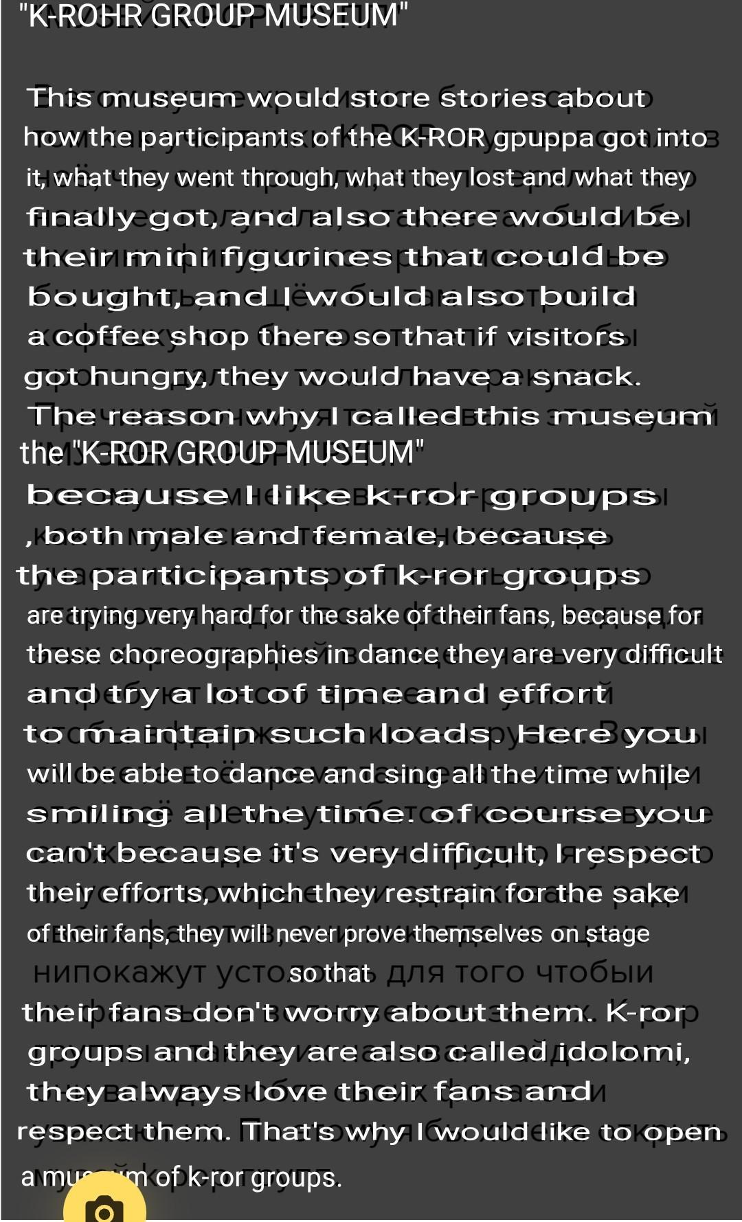 This museum would contain stories about how the members of the K-POP group got into it, what they went through, what they lost, and what they finally got, and there would also be mini-figures of them that could be bought. I would also build a cafe. This cafe would be a place, where the visitors , if they were hungry, could instantly have a bite to eat. The reason why I called this museum "K-POP GROUP MUSEUM" is that I like k-pop groups. Both male and female k-pop members work very hard for their fans. The choreographies and dances are very difficult and require a lot of time and power. Can you dance and sing while smiling all the time? Of course, you can't because it's very difficult. I respect the efforts which they put in for their fans, they never show fatigue on stage, so their fans don't worry about them. K-pop group`s members are also called idols, they always love and respect their fans. That's why I would like to open a k-pop museum.