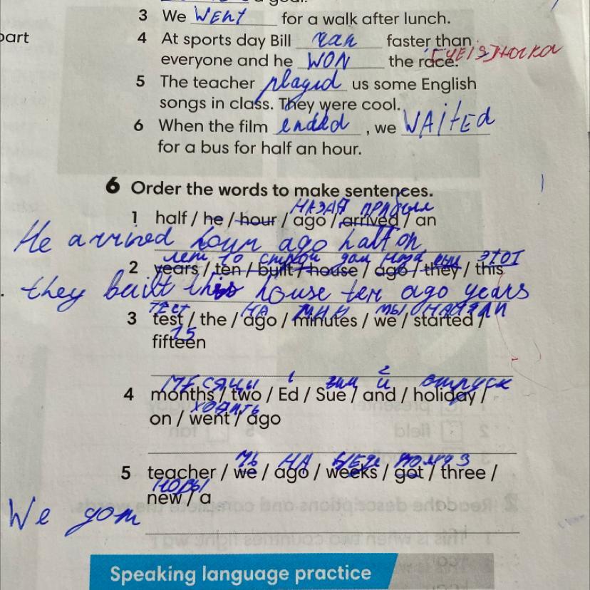 6.1. He arrived half an hour ago. 2. They built this house ten years ago 3. We started the test fifteen minutes ago. 4. Ed and Sue went on holidays two months ago. 5. We got a new teacher three weeks ago.