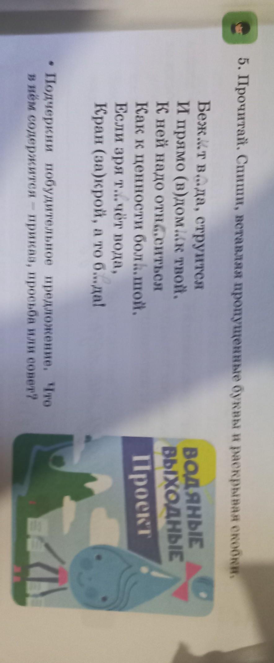 Побудительное предложение - последнее. Это совет, так как автор просит нас не лить воду, и предупреждает, как бы давая совет: Кран закрой, а то беда!