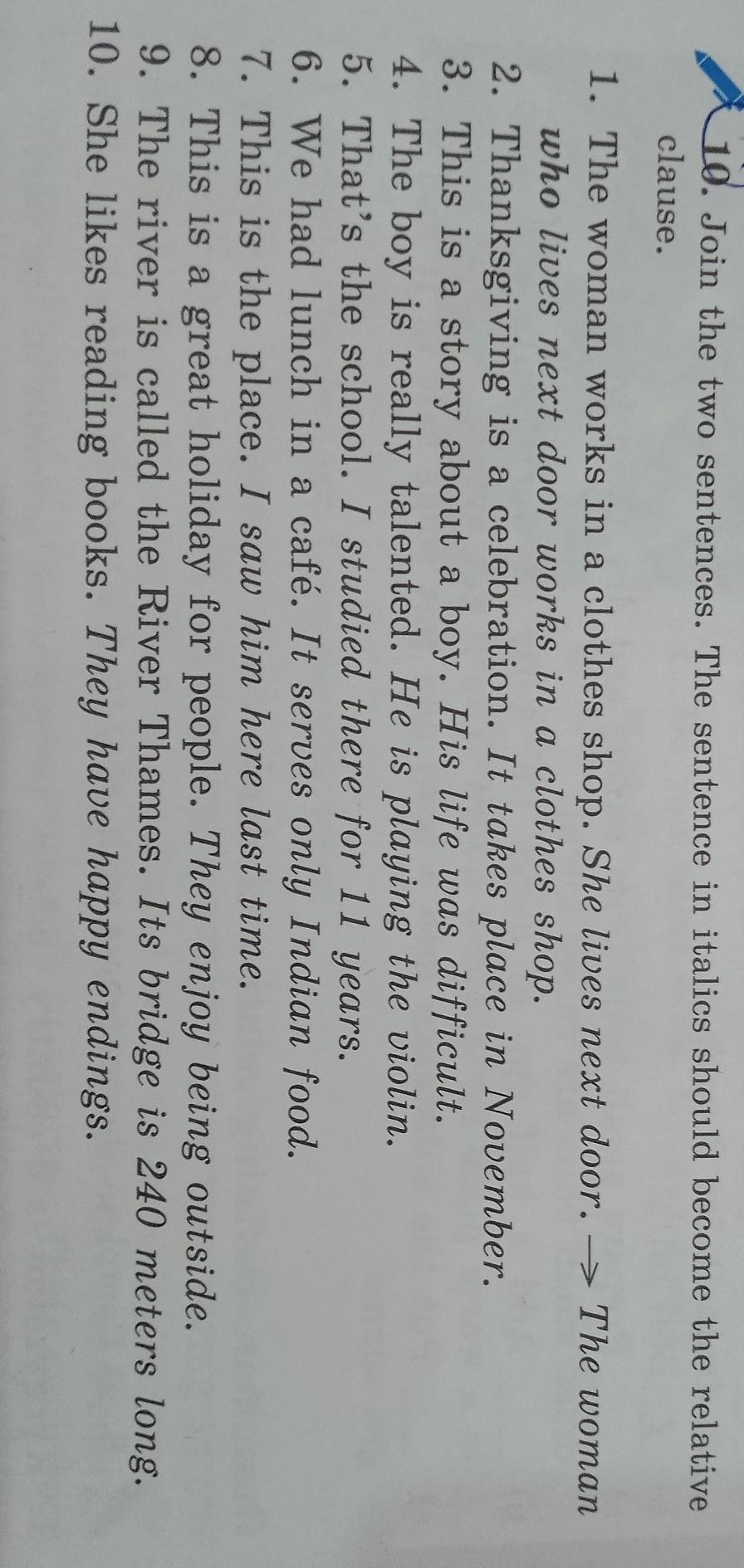 Задание (10. Join the two sentences. The sentence in italics should become the relative clause). 1. The woman works in a clothes shop. She lives next door. -> The woman who lives next door works in a clothes shop. 2. Thanksgiving is a celebration. It takes place in November. 3. This is a story about a boy. His life was difficult. 4. The boy is really talented. He is playing the violin. 5. That's the school. I studied there for 11 years. 6. We had lunch in a café. It serves only Indian food. 7. This is the place. I saw him here last time. 8. This is a great holiday for people. They enjoy being outside. 9. The river is called the River Thames. Its bridge is 240 meters long. 10. She likes reading books. They have happy endings.