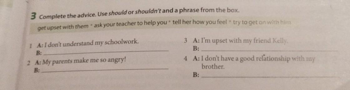 3 Complete the advice. Use should or shouldn't and a phrase from the box. get upset with them ask your teacher to help you tell her how you feel try to get on with him 1 A: I don't understand my schoolwork. B: 2 A: My parents make me so angry! B: 3 A: I'm upset with my friend Kelly, B: 4. A: I don't have a good relationship with my brother. B: