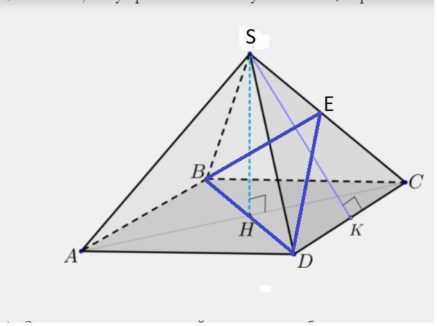 Искомый угол - это угол между высотами ВЕ и ЕD к боковому ребру.