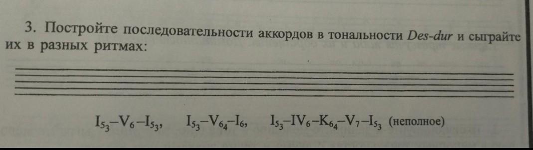 МУЗЫКАНТЫ, ПОМОГИТЕ, ПОЖАЛУЙСТА!! Постройте последовательности аккордов в тональности Des-dur и сыграйте их в разных ритмах: I53,-V6-I53, I53-V64-I6, I53-IV6-K64-V7-I53 (неполное)