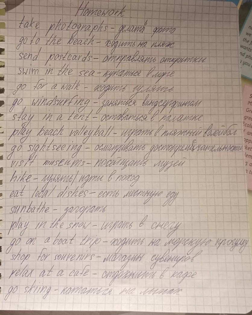 take photographs, go to the beach, send postcards, swim in the sea, go for a walk, go windsurfing, stay in a tent, play beach volleyball, go sightseeing.