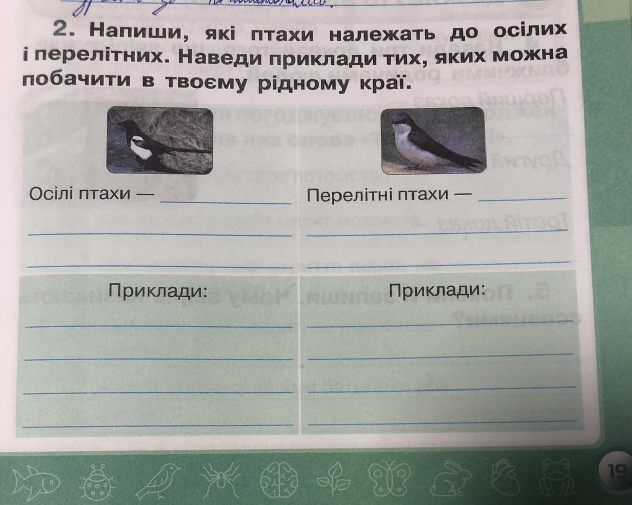 Осілі : снігур Синиця голуб Перелітні;дикі качки ластівки лелека білий чорногуз