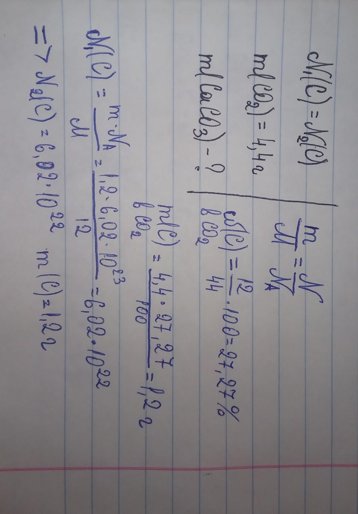 Какова масса мрамора (СаСО3), содержащего столько же атомов углерода, сколько их в 4,4г. углекислого газа