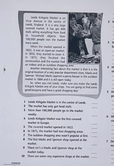 1 * Read the text below and mark the answers T (true), F (false) or DS (doesn't say). Leeds Kirkgate Market Leeds Kirkgate Market is on Vicar Avenue in the centre of Leeds, England. It is a very large covered market. It has got 800 stals selling everything from food to household objects. Over 100,000 people visit the market every week When the market opened in 1822, it was an open-air market. In 1850, they started to cover it In 1875, they finished the construction and the market had an indoor and an outdoor shopping area. Another interesting fact about this market is that it is the original location of a very popular department store, Marks and Spencer. Michael Marks opened a penny bazaar in the outdoor market in 1884 and it is still open today. So, when you visit Leeds, make sure you make the Leeds Kirkgate Market one of your stops. You are going to find some good bargains and have a great shopping day! 1 Leeds Kirkgate Market is in the centre of Leeds. 2 The market has only got food stalls. 3 More than 100,000 people go to the market weekly. 4 Leeds Kirkgate Market was the first covered market in Europe. 5 The covered market opened in 1822. 6 In 1875, the market had two shopping areas. 7 The outdoor shopping area wasn't popular at first. помогите дам много баллов