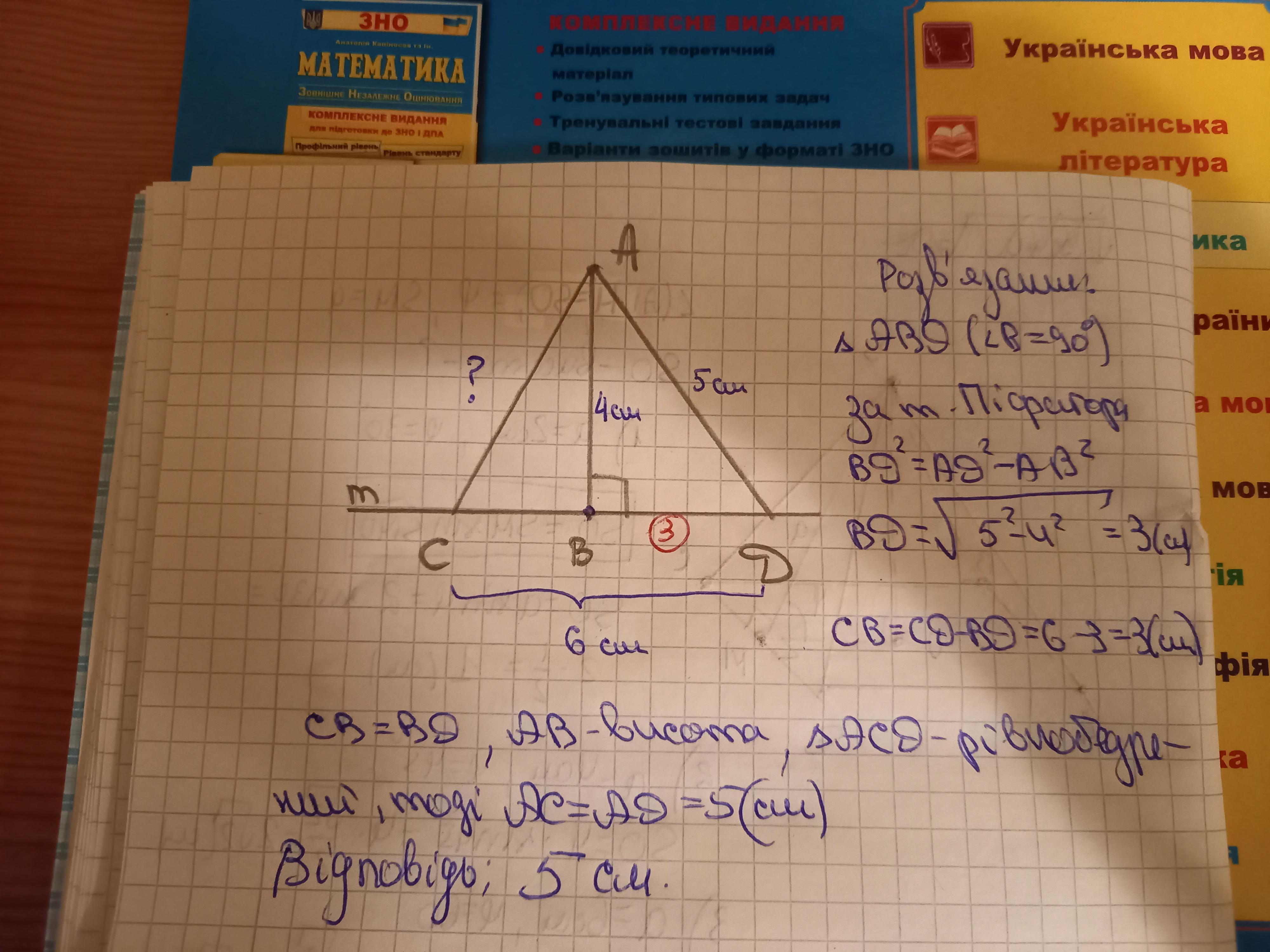 Із точки А до прямої m проведено дві похилі АС і АD та перпендикуляр АВ, так, що точки С і D лежать по різні боки від точки В. Знайдіть довжину АС, якщо АВ=4см, АD=5см, СD=6см.