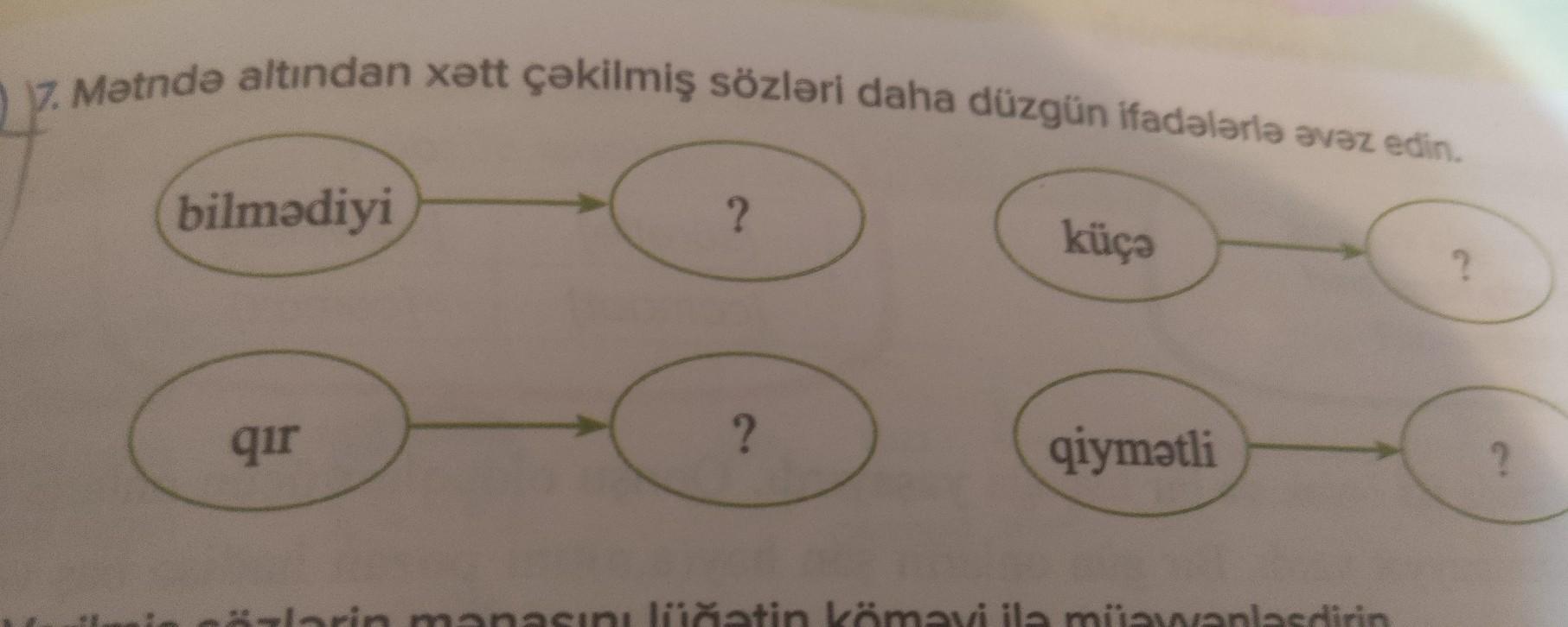 7. Mətndə altından xətt çəkilmiş sözleri daha düzgün ifadələrlə əvəz edin. bilmədiyi, küçə, qır,qiymətli