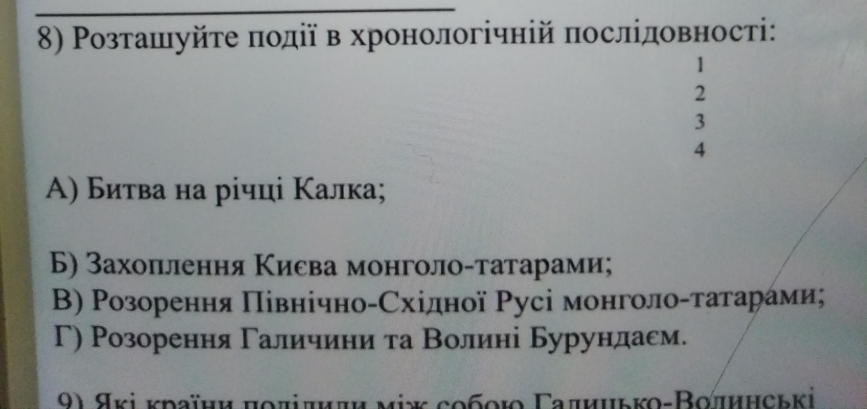Объяснение: хронологічна послідовність - послідовність історичних події за часом. Тому битва на річці Калка у часі, яка відбулася у 1223 р., займає першу позицію; розорення Північно-Східної Русі монголо-татарами, яке відбулося з 1237 по 1238 рр., займає другу позицію; монголо-татари захопили Київ у 1240 р., тому - 3 місце; розорення Галичини та Волині Бурундаєм займає четверту позицію, адже ця подія відбулася протягом 1258 по 1260 рр.