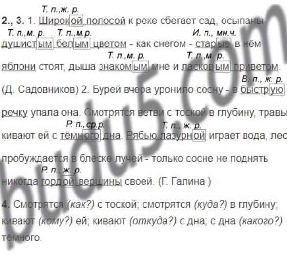 1)прочитайте широкой полосой к реке сбегает сад,осыпаны душистым белым цветом-как снегом-старые в нём яблони стоят,дыша знакомым мне и ласковым приветом.(Д.Садовников.)2.бурей вчера уронила сосну-в быструю речку упала она.Смотрятся ветви с тоской в глубину,травы кивают ей с тёмного дна.Рябью лазурной играет вода,лес пробуждает в блеске лучей-только сосне не поднять никогда гордой вершины своей!(Г.Галина.) 2.Спишите.подчеркните прилагательные вместе с теми существительными,с которыми они согласуются 3.выжелите окончания прилагательных,укажите род и падеж. 4.из второго предложения стихотворения Г.галина выпишите словосочетания с вопросами