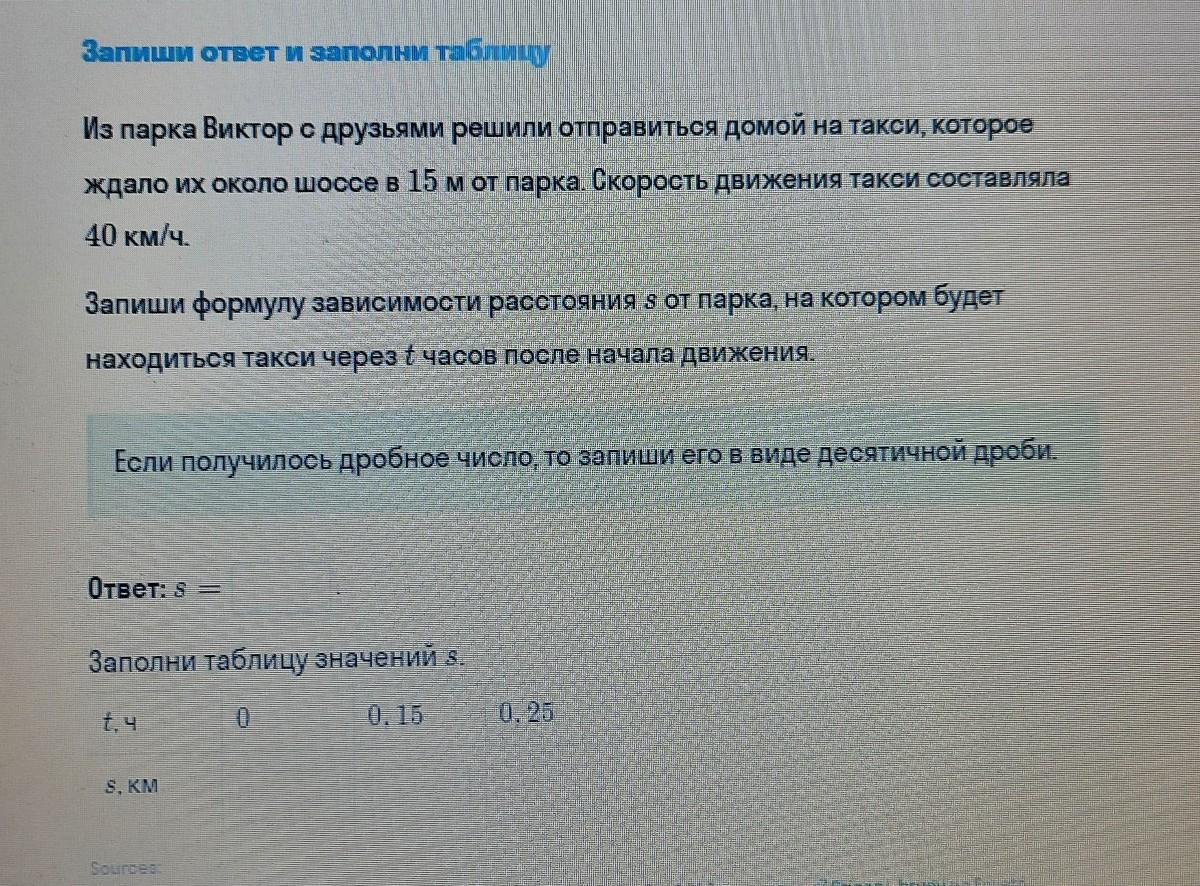 Запиши ответ и заполни таблицу Из парка Виктор с друзьями решили отправиться домой на такси, которое ждало их около шоссе в 15 м от парка. Скорость движения такси составляла 40 км/ч. Запиши формулу зависимости расстояния я от парка, на котором будет находиться такси через часов после начала движения. Если получилось дробное число, то запиши его в виде десятичной дроби. Ответ: 8 Заполни таблицу значений ѕ. t, ч 0 0.15 0,25 s, KM