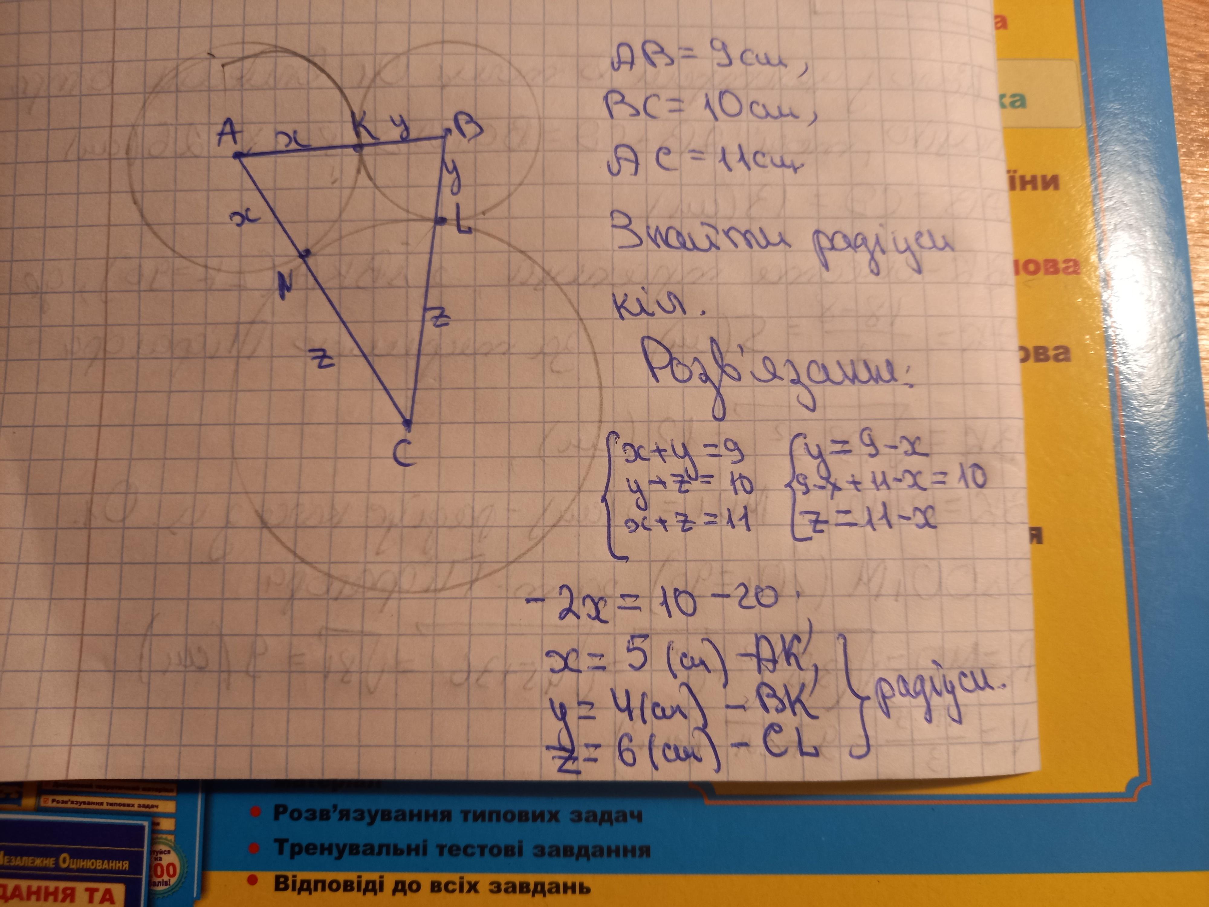 Три кола попарно мають зовнішній дотик. Відрізки, які з’єднують їх центри, утворюють трикутник із сторонами 9 см, 10 см і 11 см. Знайдіть радіуси кіл.