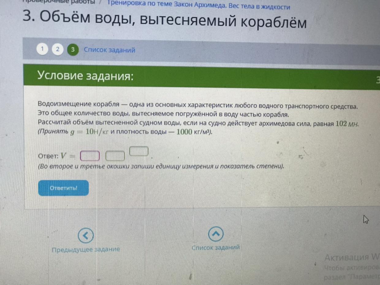 V = Fa/ (p*g) = 102 000 000 Н / (1000кг/м^3 * 10Н/кг) = 10 200 м^3