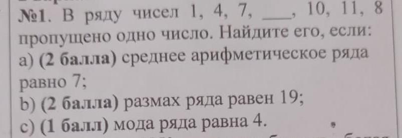 2 вариант 1. В ряду чисел 1, 4, 7, ___ 10, 11, 8 пропущено одно число. Найдите его, если: а) (2 балла) среднее арифметическое ряда равно 7; b) (2 балла) размах ряда равен 19; с) (1 балл) мода ряда равна 4.