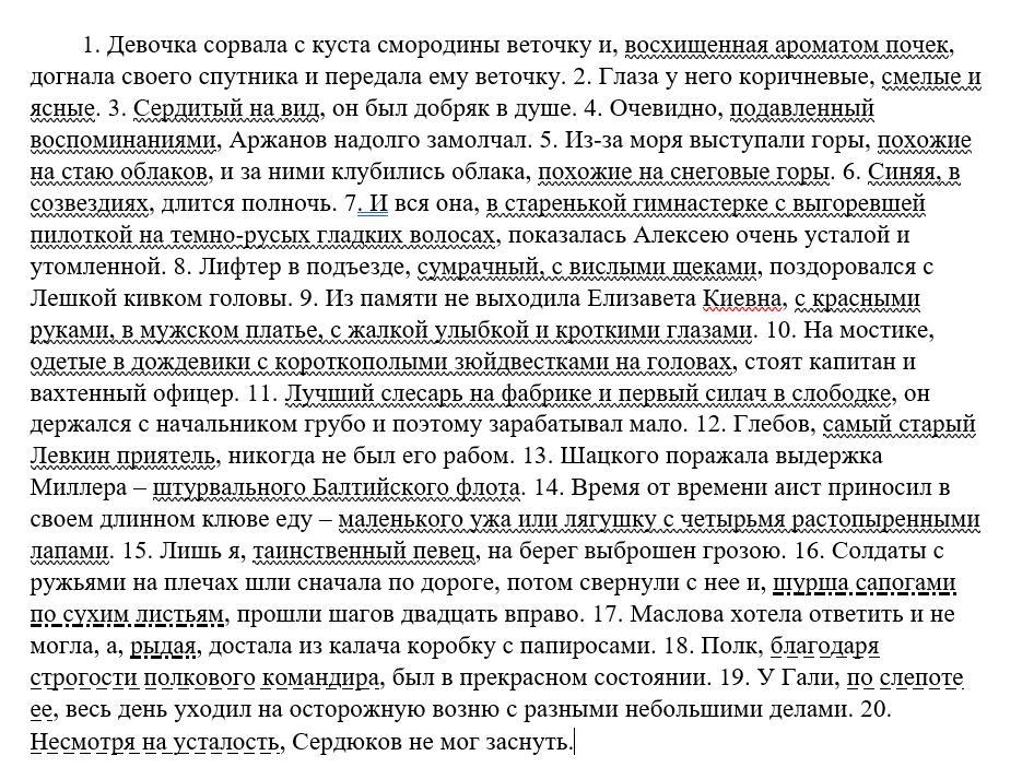 1. Девочка сорвала с куста смородины веточку и восхищенная ароматом почек догнала своего спутника и передала ему веточку. 2. Глаза у него коричневые смелые и ясные. 3. Сердитый на вид он был добряк в душе. 4. Очевидно, подавленный воспоминаниями Аржанов надолго замолчал. 5. Из-за моря выступали горы похожие на стаю облаков и за ними клубились облака похожие на снеговые горы. 6. Синяя в созвездиях длится полночь. 7. И вся она в старенькой гимнастерке с выгоревшей пилоткой на темно-русых гладких волосах показалась Алексею очень усталой и утомленной. 8. Лифтер в подъезде сумрачный с вислыми щеками поздоровался с Лешкой кивком головы. 9. Из памяти не выходила Елизавета Киевна с красными руками в мужском платье с жалкой улыбкой и кроткими глазами. 10. На мостике одетые в дождевики с короткополыми зюйдвестками на головах стоят капитан и вахтенный офицер. 11. Лучший слесарь на фабрике и первый силач в слободке он держался с начальником грубо и поэтому зарабатывал мало. 12. Глебов самый старый Левкин приятель никогда не был его рабом. 13. Шацкого поражала выдержка Миллера штурвального Балтийского флота. 14. Время от времени аист приносил в своем длинном клюве еду маленького ужа или лягушку с четырьмя растопыренными лапами. 15. Лишь я таинственный певец на берег выброшен грозою. 16. Солдаты с ружьями на плечах шли сначала по дороге, потом свернули с нее и шурша сапогами по сухим листьям прошли шагов двадцать вправо. 17. Маслова хотела ответить и не могла а рыдая достала из калача коробку с папиросами. 18. Полк благодаря строгости полкового командира был в прекрасном состоянии. 19. У Гали по слепоте ее весь день уходил на осторожную возню с разными небольшими делами. 20. Несмотря на усталость Сердюков не мог заснуть.