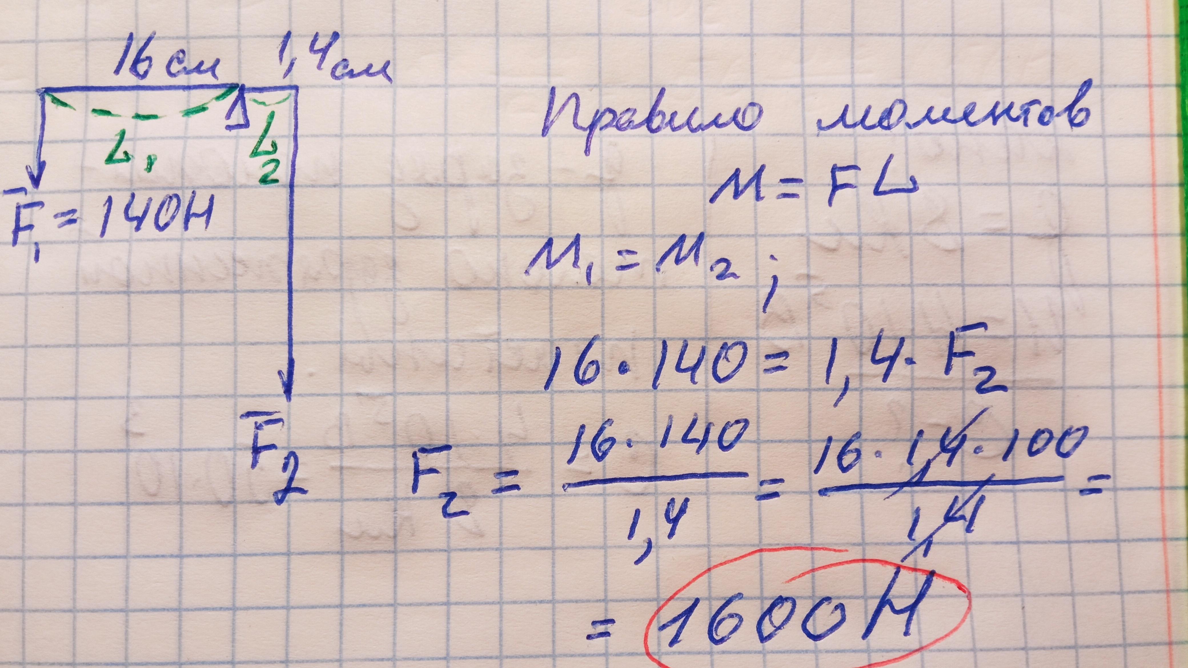 правило рычага - плечо* силу равно для обеих сторон. соответственно, 1.4*х=16*140 и х=16*140/1.4, если плечи различаются в 16/1.4=11,43 раза, то и сила больше в 11.43 раза и равна 140 Н*11.43=1600 Н.