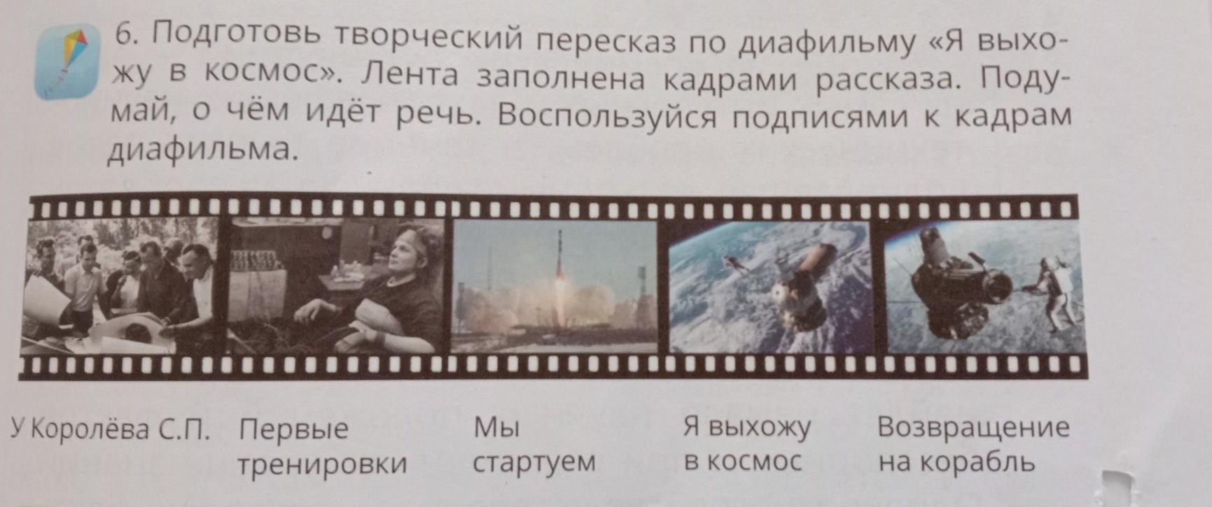 6. Подготовь творческий пересказ по диафильму «Я выхо- жу в космос». Лента заполнена кадрами рассказа. Поду- май, о чём идёт речь. Воспользуйся подписями к кадрам диафильма.