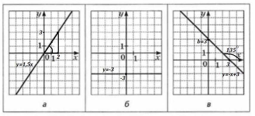 в) На рисунке угол наклона α=135° , tg135°= -1 , b=3 . Уравнение прямой у= -х+3 .