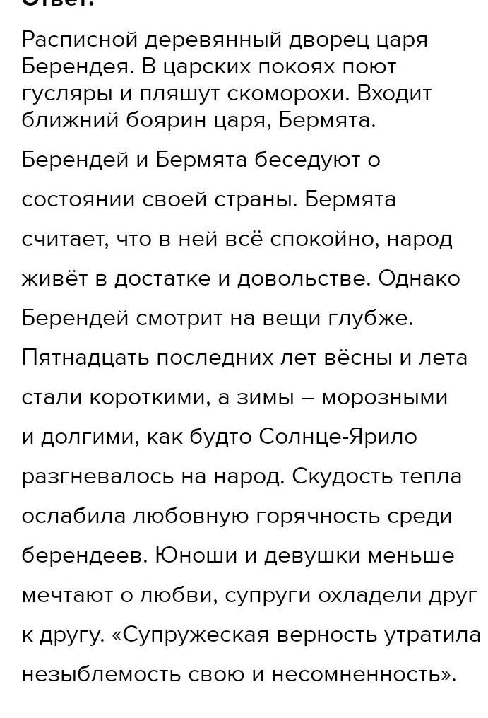 Царь берендеев замечает, что Ярило не откликается на их призыв. Народ напрасно «тьмотысячной толпой» взывает Берендей думает, что бог Солнца рассердился. Объясняет он и причину. Ярило зол из-за того, что сердца людей остудились, у молодежи нет страстных взоров, супруги стали равнодушны друг к другу. Души берендеев легко загораются завистью.