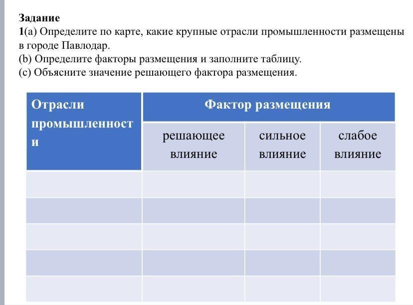 1(а) Определите по карте, какие крупные отрасли промышленности размещены в городе Павлодар. (b) Определите факторы размещения и заполните таблицу. (c) Объясните значение решающего фактора размещения. Фактор размещения Отрасли промышленност решающее сильное слабое и ВЛИЯНие Влияние Влияние