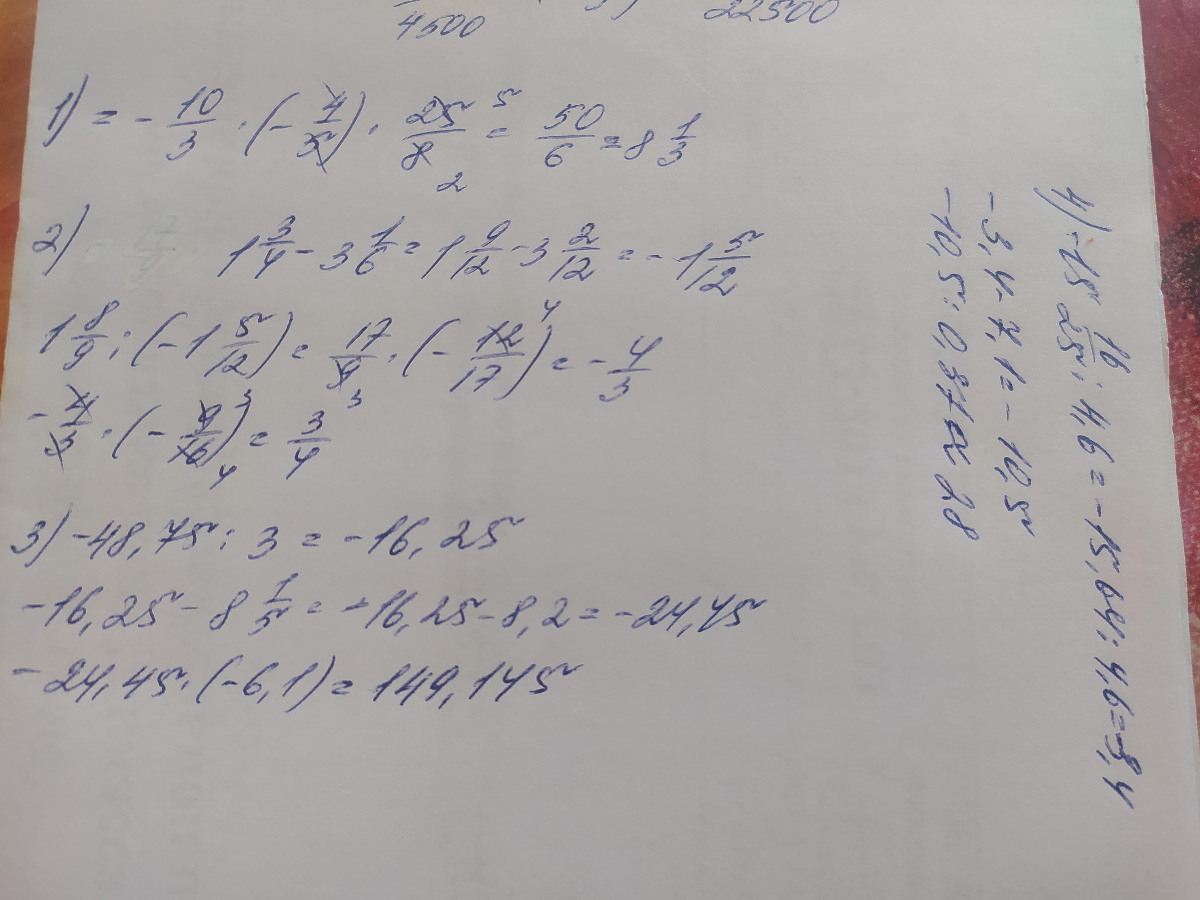 1) (-3.1/3)÷(-1.1/4)÷8/25; 2) 1.8/9÷(1.3/4-3.1/6)×(-9/16); 3) (-48,75÷3.0-8.1/5)×(-6,1); 4) (-15.16/25÷4,6-7,1)÷(+0,37);