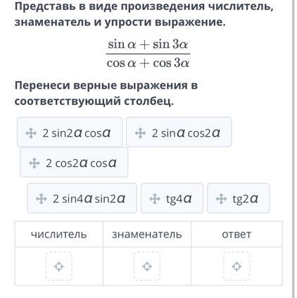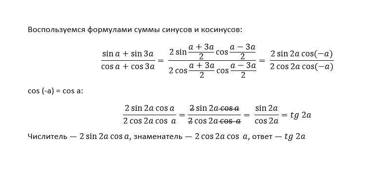 Числитель — 2 sin 2a cos a, знаменатель — 2 cos 2a cos a, ответ — tg 2a