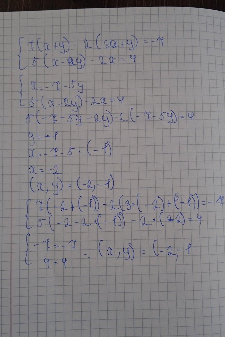 7(x+y)-2(3x+y)=-7 7x+7y-6x-2y=-7 x+5y=-7 x=-7-5y