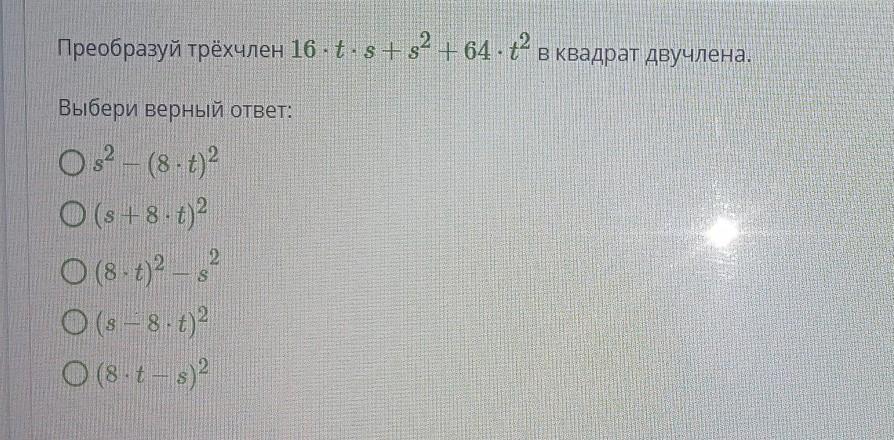 Преобразуй трёхчлен 16×t×s+s²+64×t²