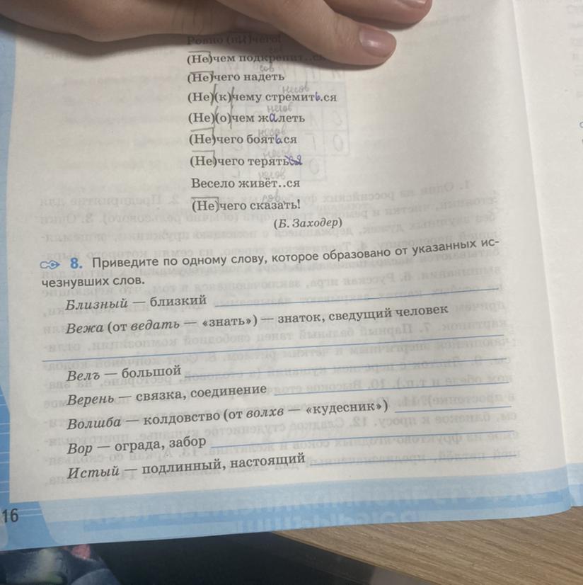8. Приведите по одному слову, которое образовано от указанных ис чезнувших слов. Близный - близкий Вежа (от ведать - «знать») - знаток, сведущий человек Велъ большой Верень - связка, соединение Волшба - колдовство (от волхв «кудесник») Вор - ограда, забор Исмый - подлинный, настоящий