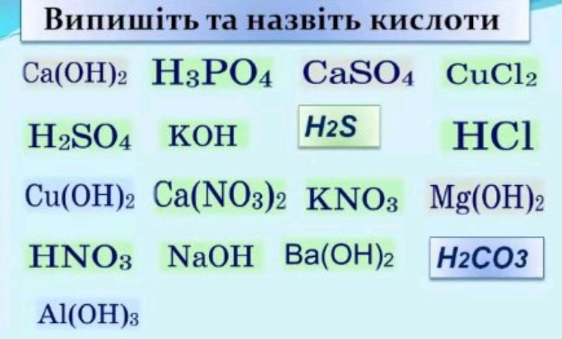 H3PO4 - ортофосфатна,H2SO4 - сульфатна, H2S - сульфідна,HCl-хлоридна,HNO3-нітратна,H2CO3 - карбонатна