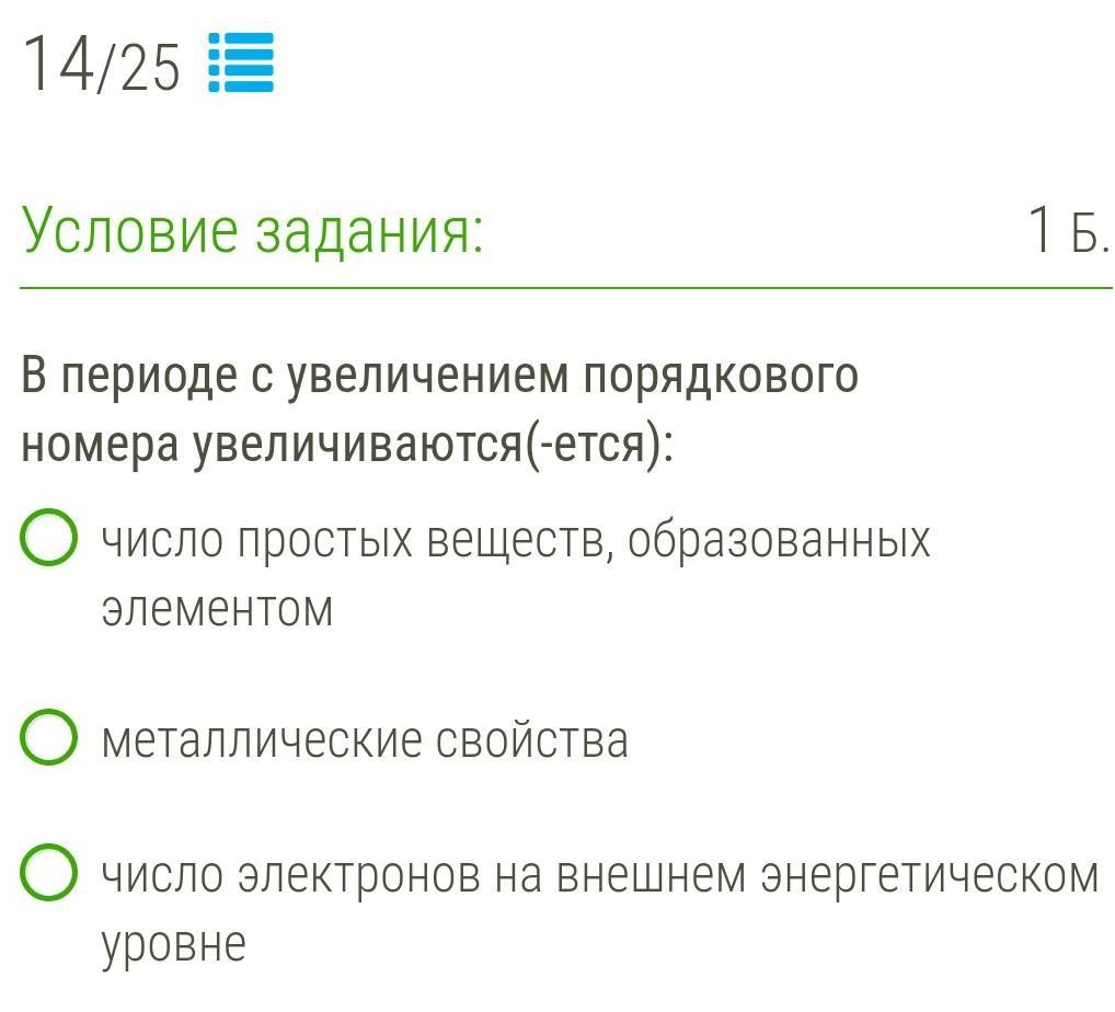 В периоде с увеличением порядкового номера увеличиваются(-ется): число простых веществ, образованных Элементом металлические свойства ЧИСЛО электронов на внешнем энергетическом Гуровне