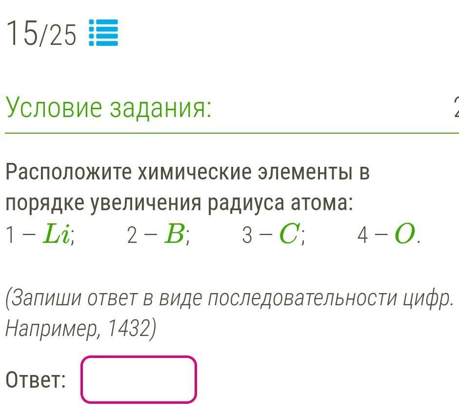 Расположите химические элементы в порядке увеличения радиуса атома: 1 – Li; 2 - В; 3 - С; 4-O. (Запиши ответ в виде последовательности цифр. Например, 1432) Ответ: