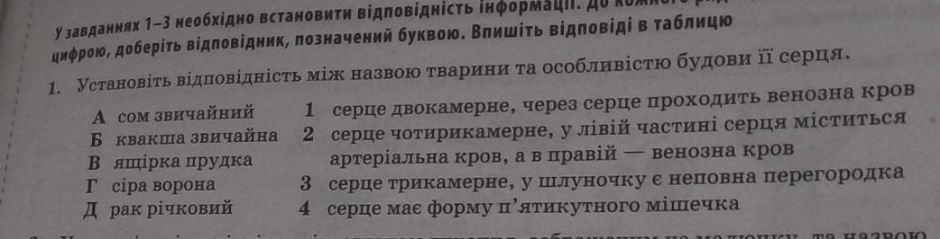 1. Установіть відповідність між назвою тварини та особливістю будови і серця.