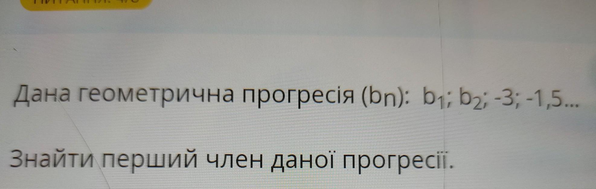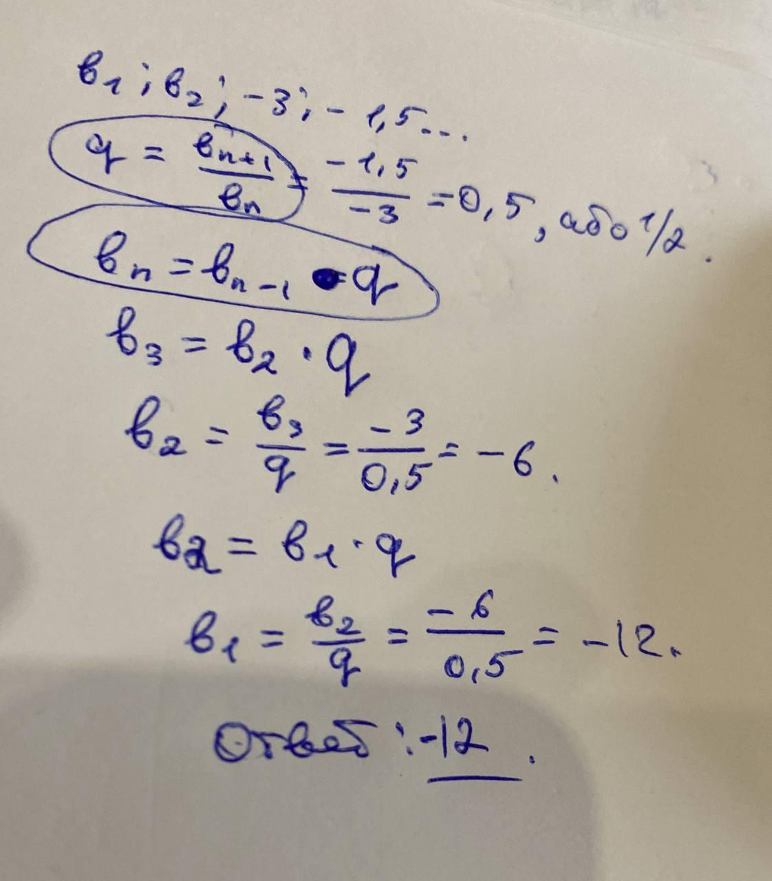 Дана геометрична прогресія (bn): b; b2; -3; -1,5... Знайти перший член даної прогресії.