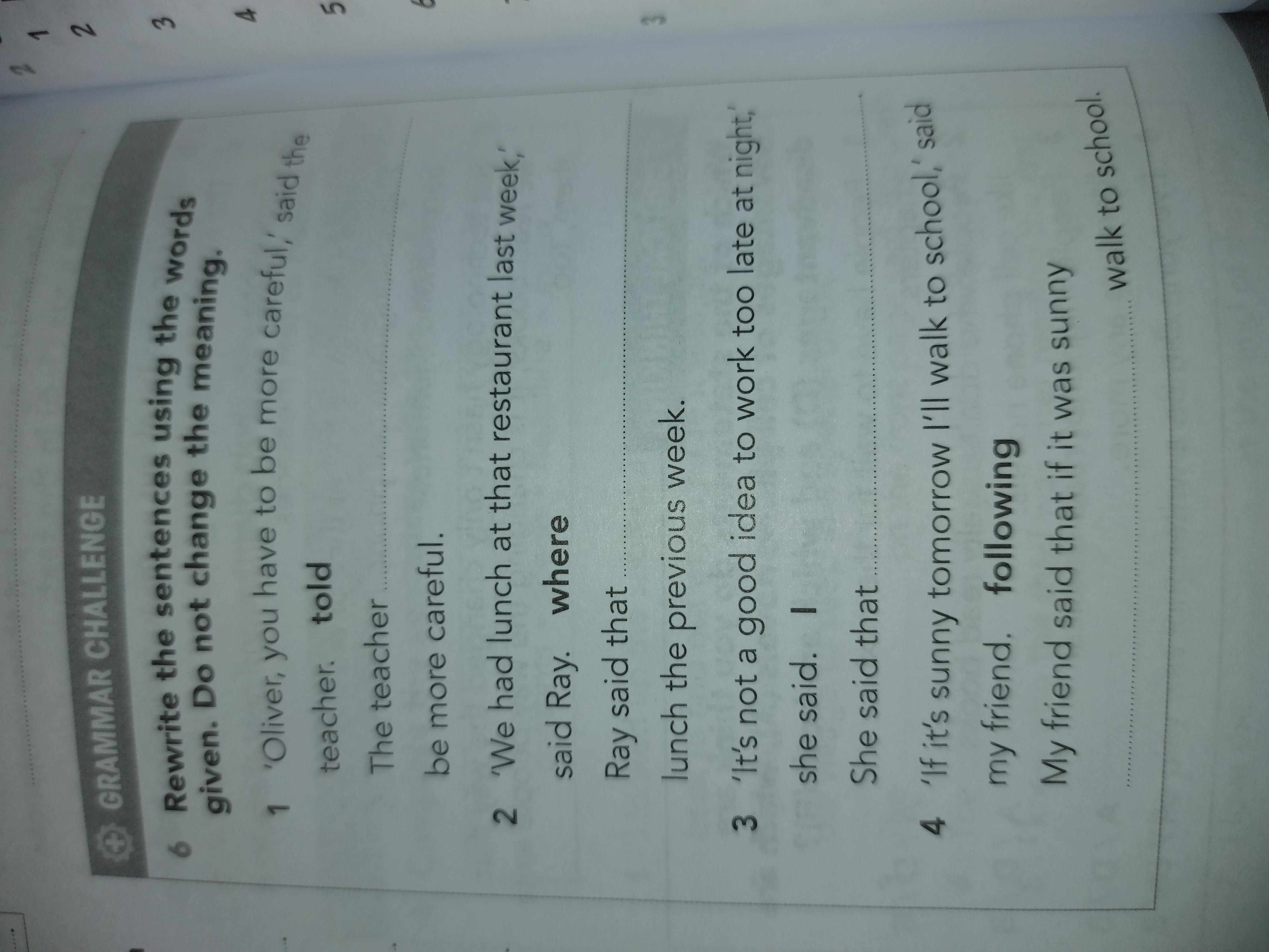 . The teacher told Oliver to be more careful. 2. Ray said where they had had lunch the previous week
