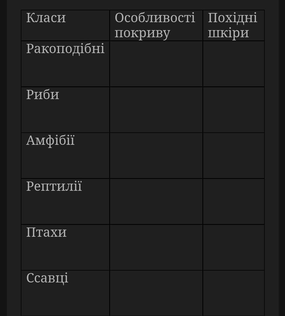 Ракоподібні-Панцир Риби-Луска Амфібії-Гола шкіра, багата на слизові залози Рептилії-Суха шкіра, вкрита щитками Птахи-Пір'я Ссавці-Хутро А про похідні шкіри, вибачте, не знаю!!!!!!))))))