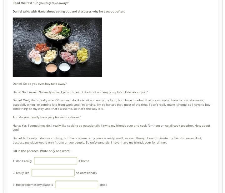 (Фрагмент из текста: "I really like cooking so occasionally I invite my friends over and cook for them or we all cook together.")