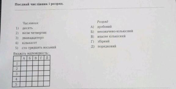 Відповідь: 1-В, 2-А, 3-Г, 4- Б, 5-Д