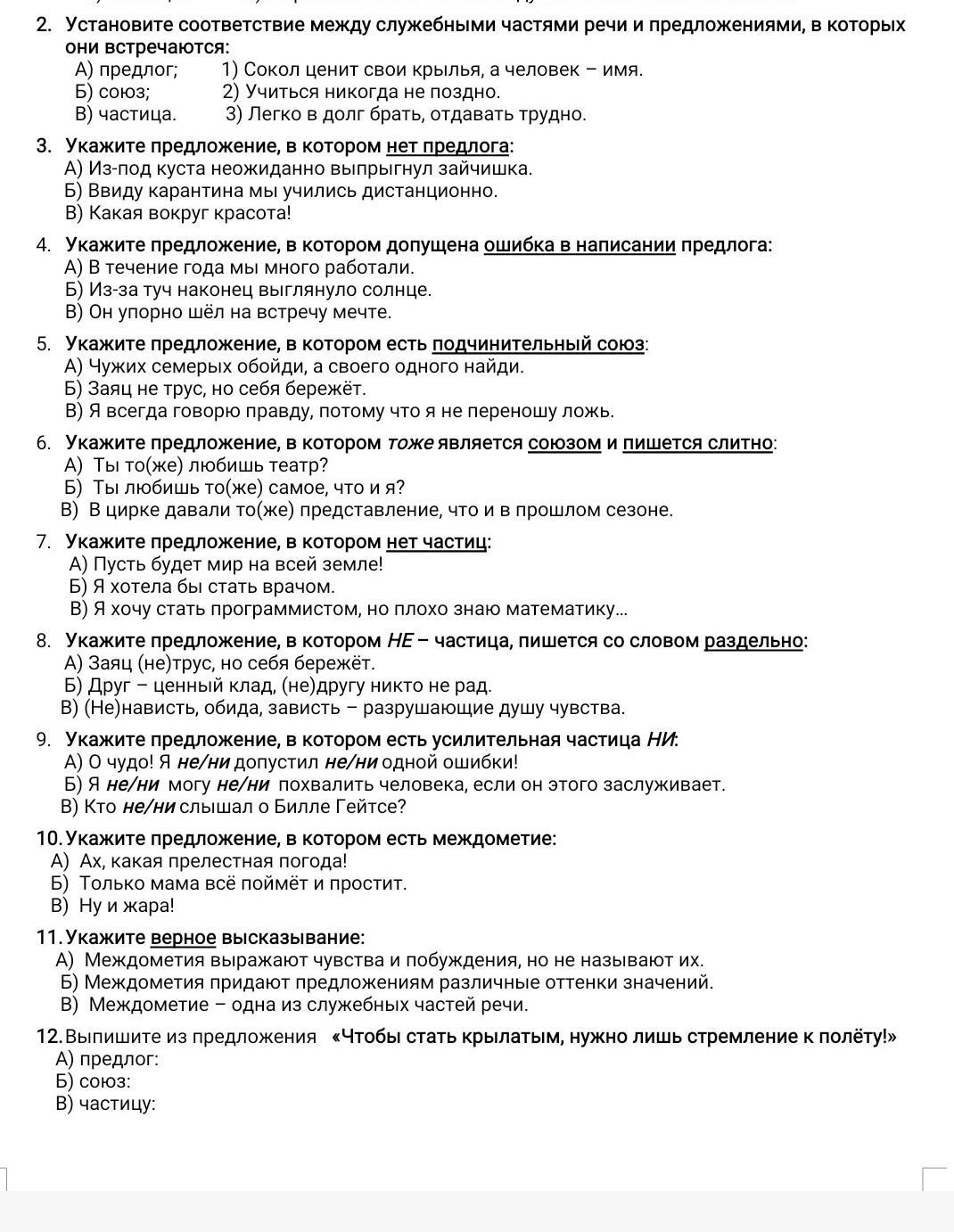 2. Установите соответствие между служебными частями речи и предложениями, в которых они встречаются: