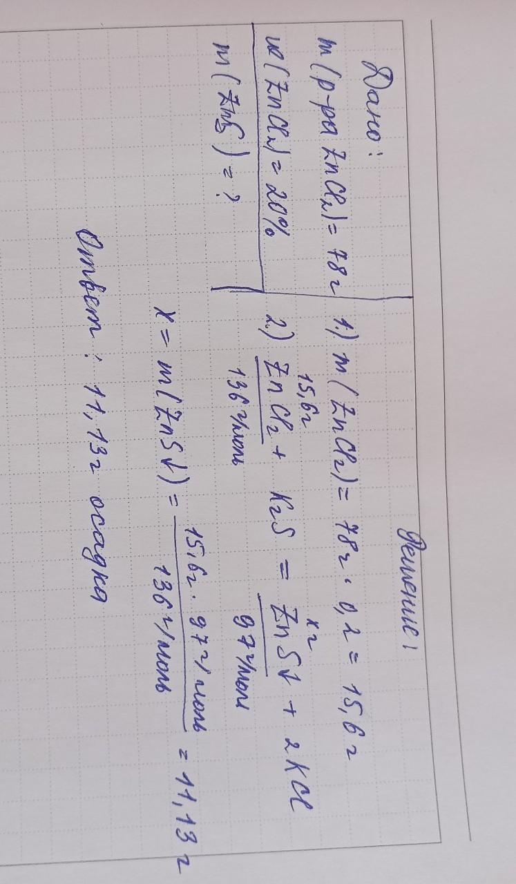 сколько грамм осадка образуется при взаимодействии раствора 78 г 20% раствора хлорида цинка с раствором сульфида калия