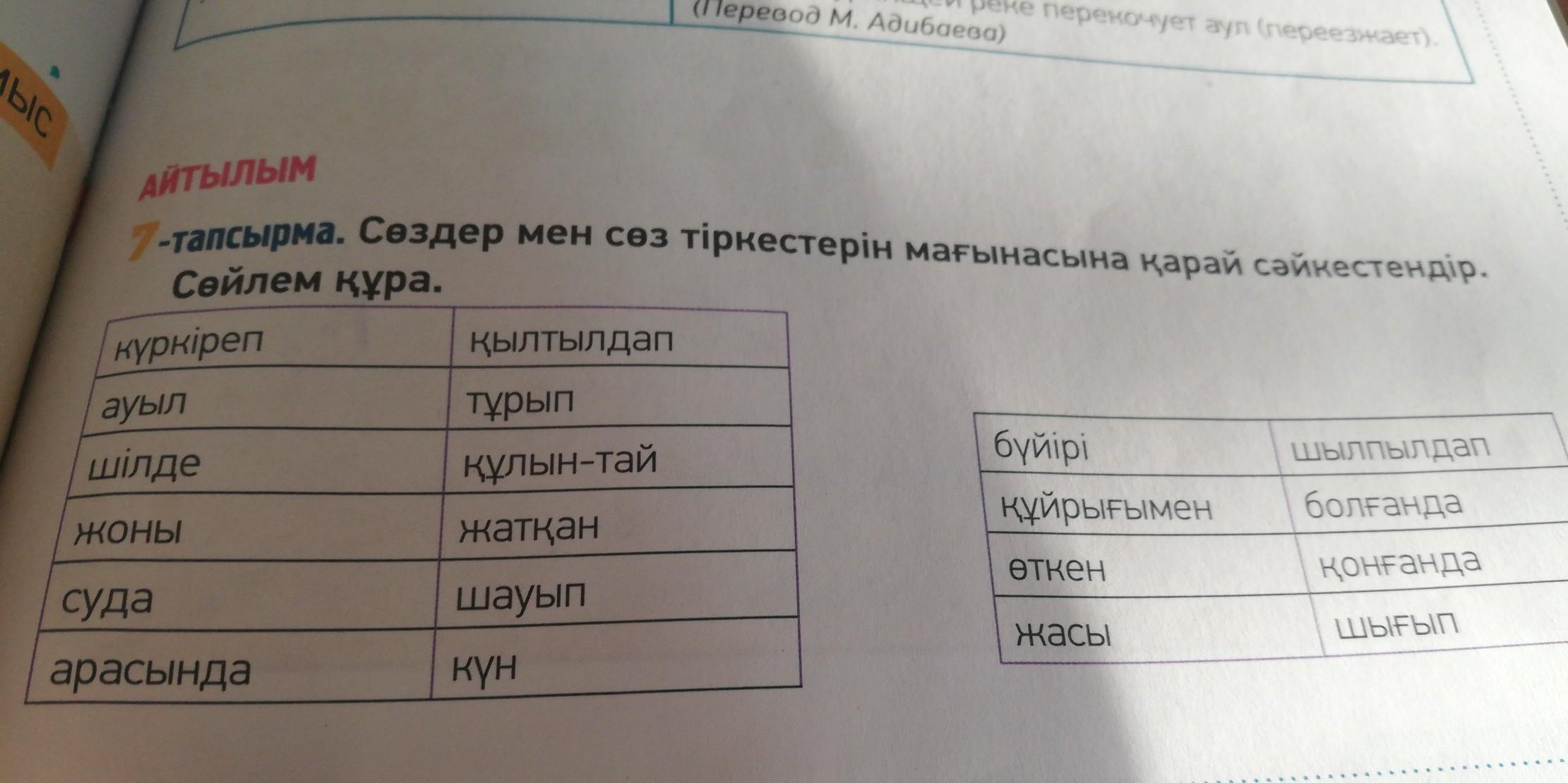 Айтылым 7-тапсырма. Сөздер мен сөз тіркестерін мағынасына қарай сәйкестендір. Сөйлем құра. күркіреп Қылтылдап ауыл тұрып Шылпылдап шілде бүйірі Құлын-тай құйрығымен болғанда ЖОНЫ жатқан қонғанда суда шауып жасы ШЫҒЫП арасында күн Өткен