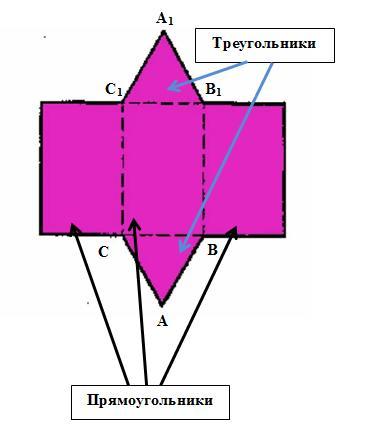 Если нужно собрать, например, правильную треугольную призму (см. рисунок 1) нужна развёртка (см. рисунок 2). Эту развёртку можно собрать из 3 равных прямоугольника и 2 равных треугольника (см. рисунок 3).