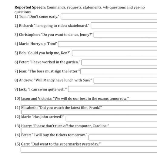 Сообщенная речь: команды, просьбы, заявления, вопросы «да» и «да-нет». 1) Том: «Не приходи рано. 2) Ричард: «Я собираюсь кататься на скейтборде». 3) Кристофер: «Хочешь потанцевать, Дженни?» 4) Марк: "Поторопись, Том!" 5) Боб: «Кен, ты не мог бы мне помочь? 6) Питер: «Я работал в саду». 7) Джин: «Босс должен подписать письмо». 8) Эндрю: «Мэнди пообедает со Сью? 9) Джек: «Я неплохо плаваю». 10) Джейсон и Виктория: «Мы приложим все усилия на завтрашних экзаменах». 11) Элизабет: «Вы смотрели последний фильм. Фрэнк?» 12) Марк: «Джон приехал?» 13) Гарри: «Пожалуйста, не выключай компьютер, Кэролайн». 14) Питер: «Я куплю билеты завтра». 15) Гэри: «Папа ушел». вчера в супермаркет».