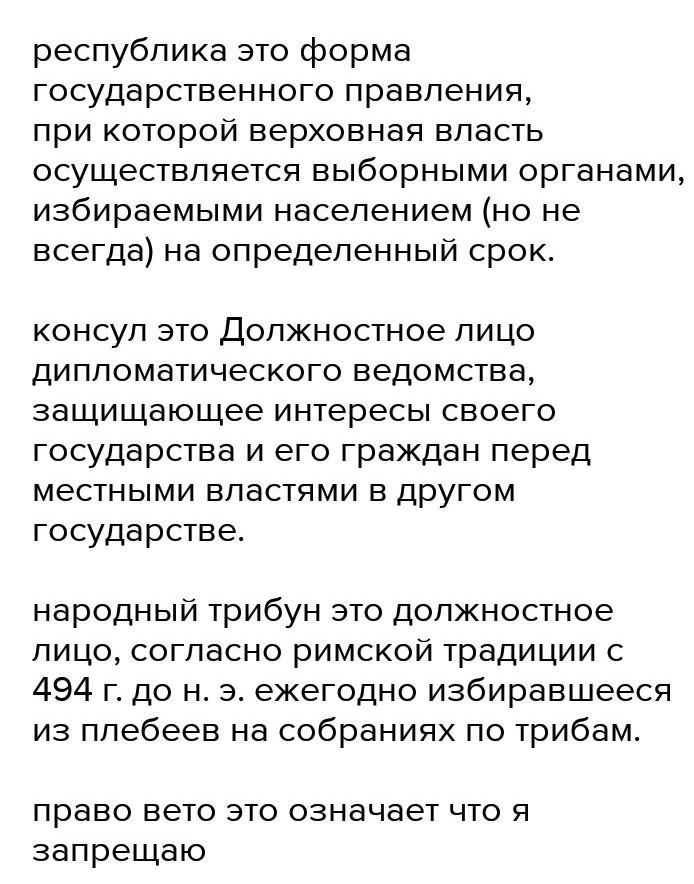 Объясните значение слов: республика, консул, народный трибун, право вето. Проверьте себя. 1. Как изменилось управление в Риме после изгнания седьмого царя? 2. Как возникли крылатые выражения: «гуси Рим спас- ли», «горе побеждённым», «Пиррова победа»? 3. Как римляне поступали с землями, отобранными у побеждённых народов Италии?