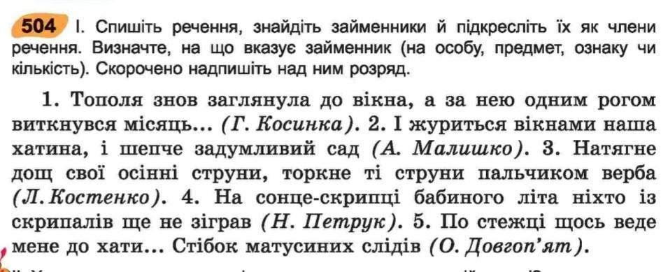 І. Спишіть речення, знайдіть займенники й підкресліть їх як члени речення. Визначте, на що вказує займенник (на особу, предмет, ознаку чи кількість). Скорочено надпишіть над ним розряд. ч 1. Тополя знов заглянула до вікна, а за нею одним рогом виткнувся місяць... (Г . К о с и н к а ). 2. І журиться вікнами наша хатина, і шепче задумливий сад (А . М а л и ш к о ). 3. Натягне дощ свої осінні струни, торкне ті струни пальчиком верба (Л . К о с т е н ко ). 4. На сонце-скрипці бабиного літа ніхто із скрипалів ще не зіграв (Н . П е т р у к ). 5. По стежці щось веде мене до хати... Стібок матусиних слідів (О . Д овгоп’я т ).