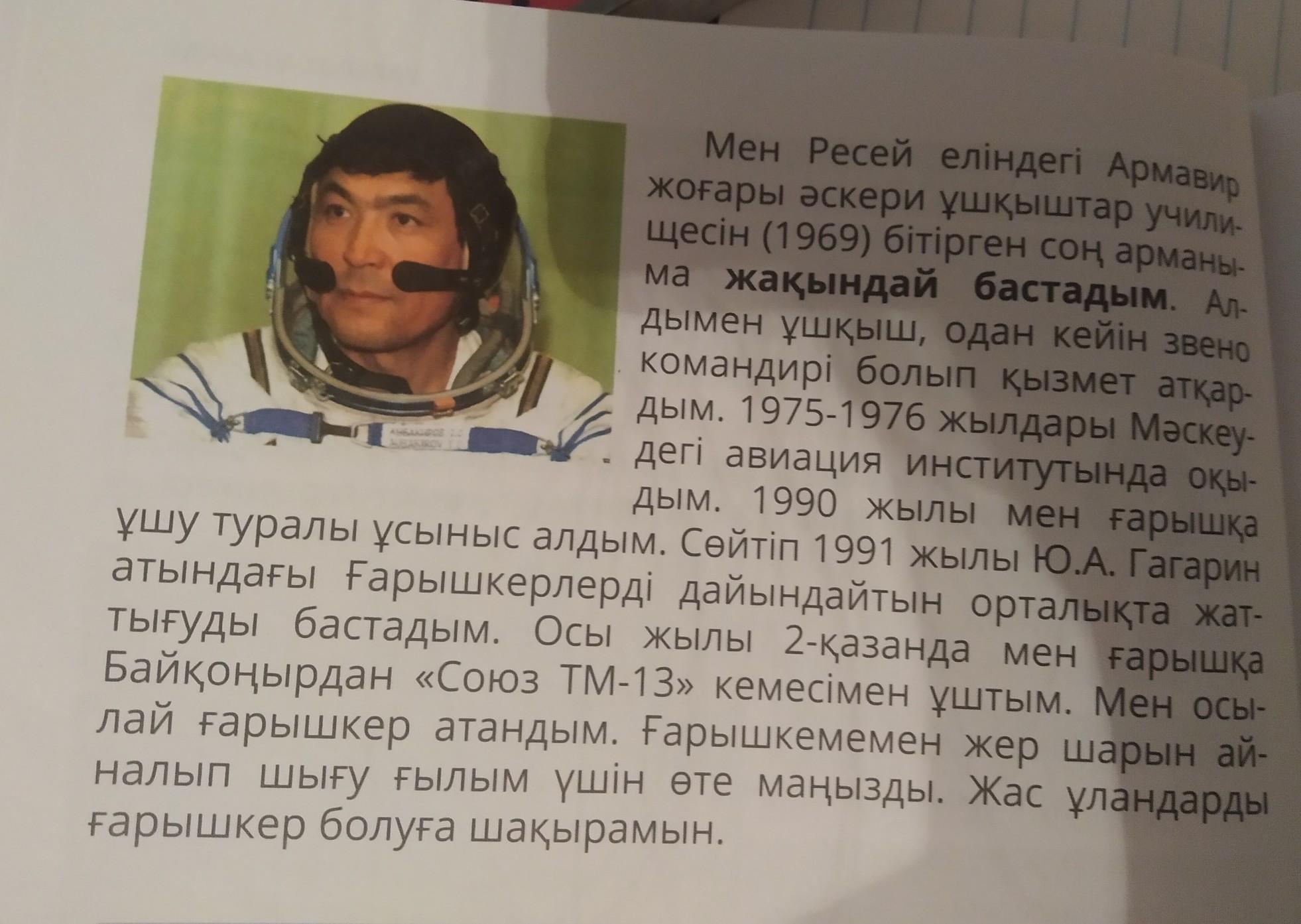 Мен аспаннан ең алғаш ұшақты көрген күннен бастап ұшкыш болуды армандадым.Менен сол кезде: "нені жақсы көресің?"-деп быреу сураса:"Ұшакты жақсы көремін",-деп жауап беретін едым. Аспан әлеміне қызықтым.(продолжение на фото)